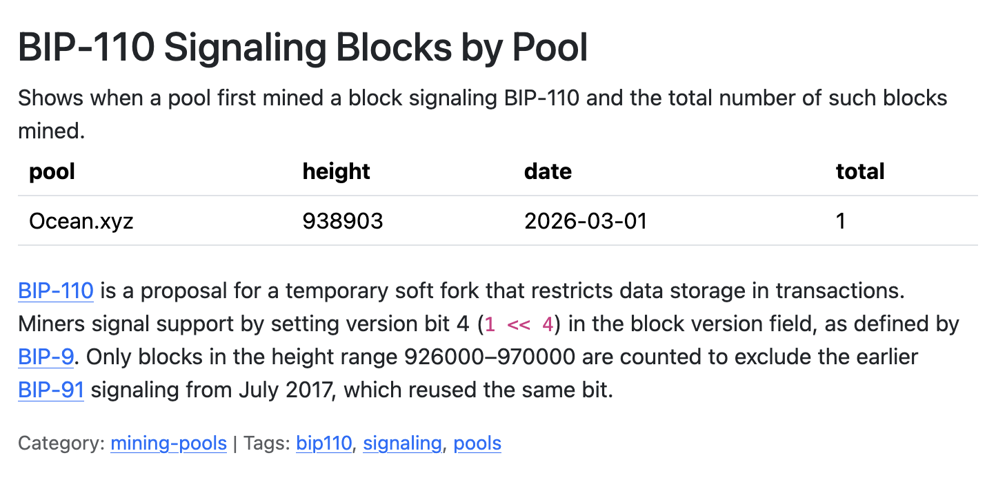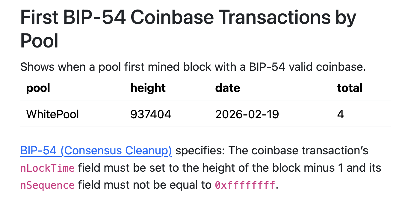 Shows when a pool first mined a block signaling BIP-110 and the total number of such blocks mined.First BIP-54 Coinbase Transactions by Pool